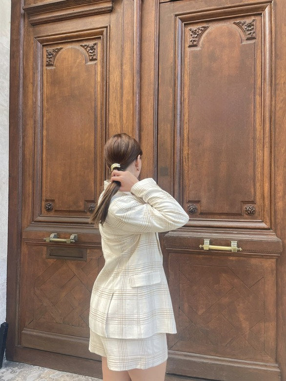 Fraîcheur et élégance s’unissent dans cet ensemble Claudie Pierlot, composé d’un blazer structuré et d’un short assorti. Sur une toile blanche lumineuse, de fines lignes marron dessinent un motif raffiné et moderne, parfait pour une allure à la fois chic et décontractée. Polyvalent, ce duo se porte aussi bien en journée qu’en soirée.